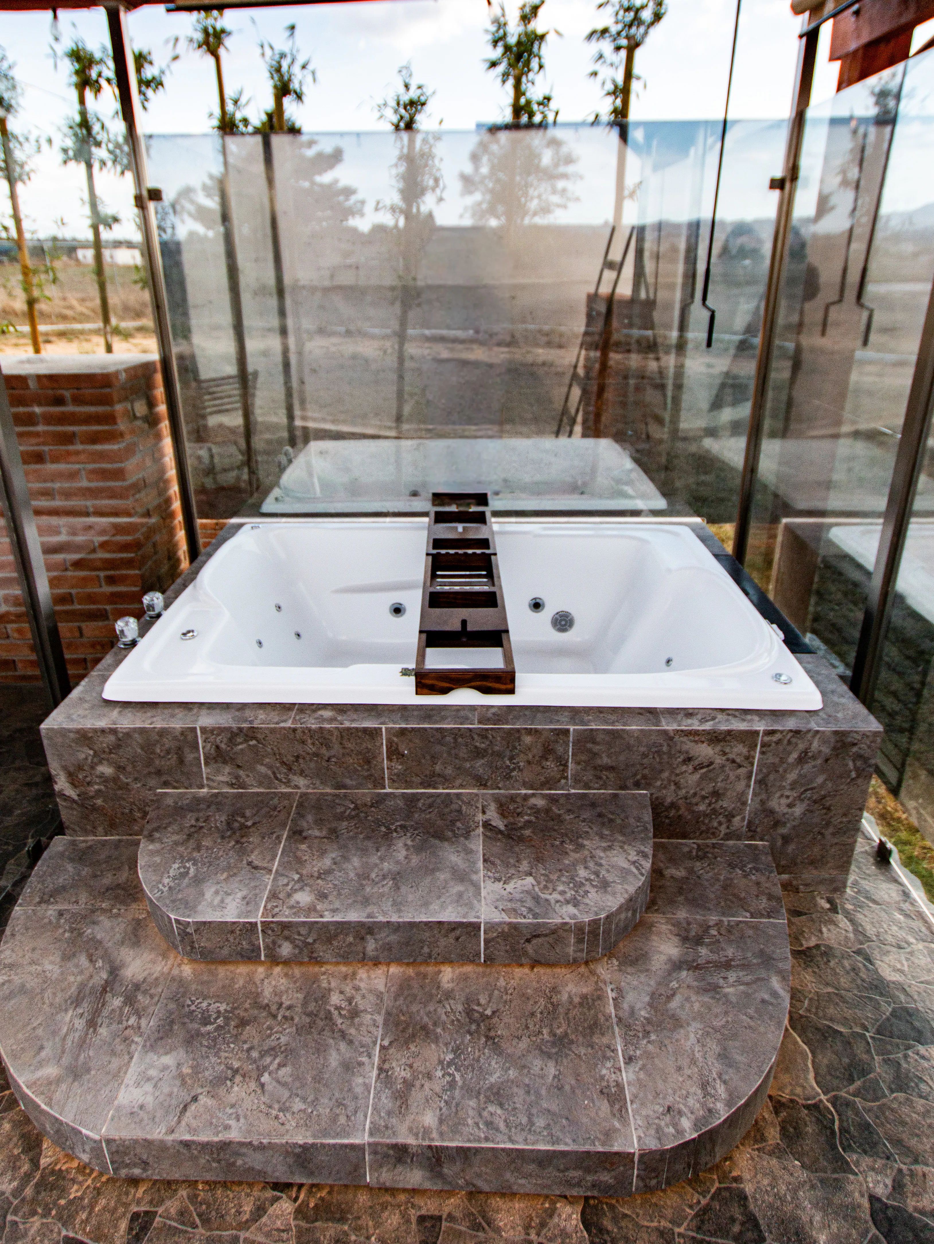- XL outdoor jacuzzi with polarized glass – privacy without losing the view of the natural surroundings.